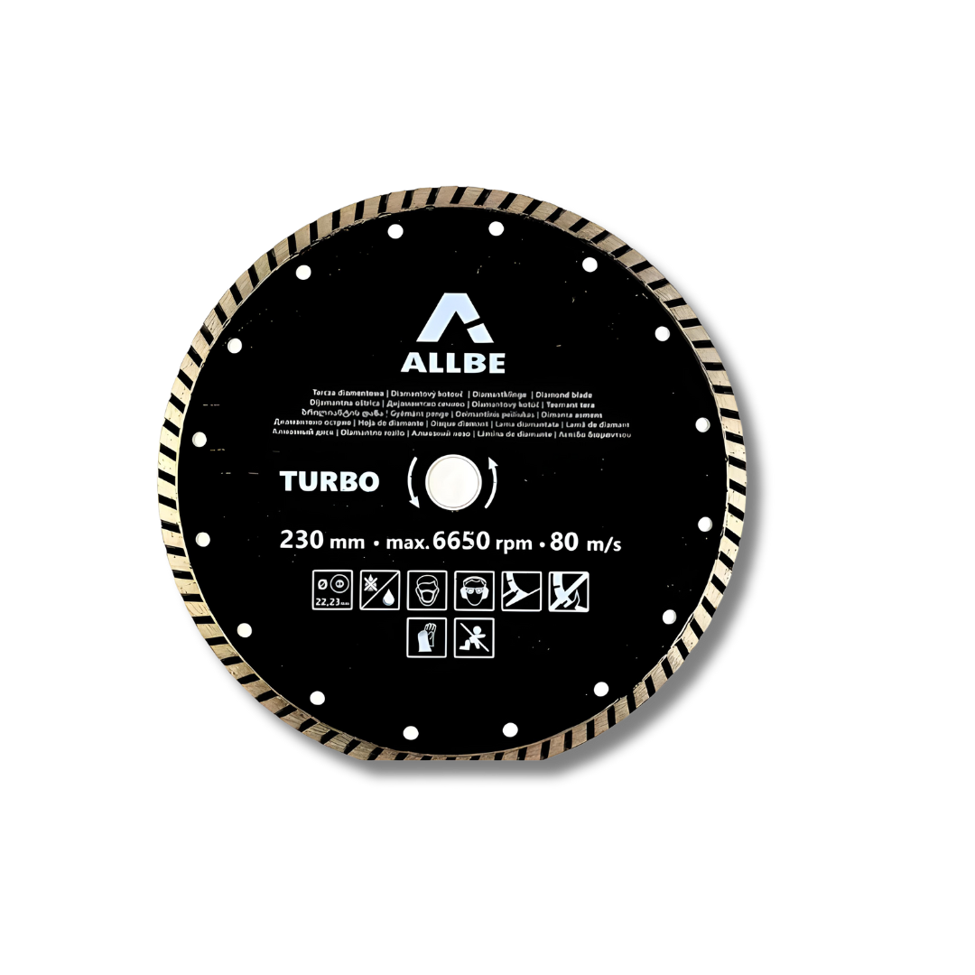 ALLBE Diamanttrennscheiben sind für die anspruchsvollsten Anwender konzipiert. Die Klinge verwendet ein TURBO-Diamantsegment von höchster Qualität, das beim Schneiden in Stahlbeton und schweren Materialien nicht stecken bleibt. Das 7 mm hohe Segment verlängert die Lebensdauer.